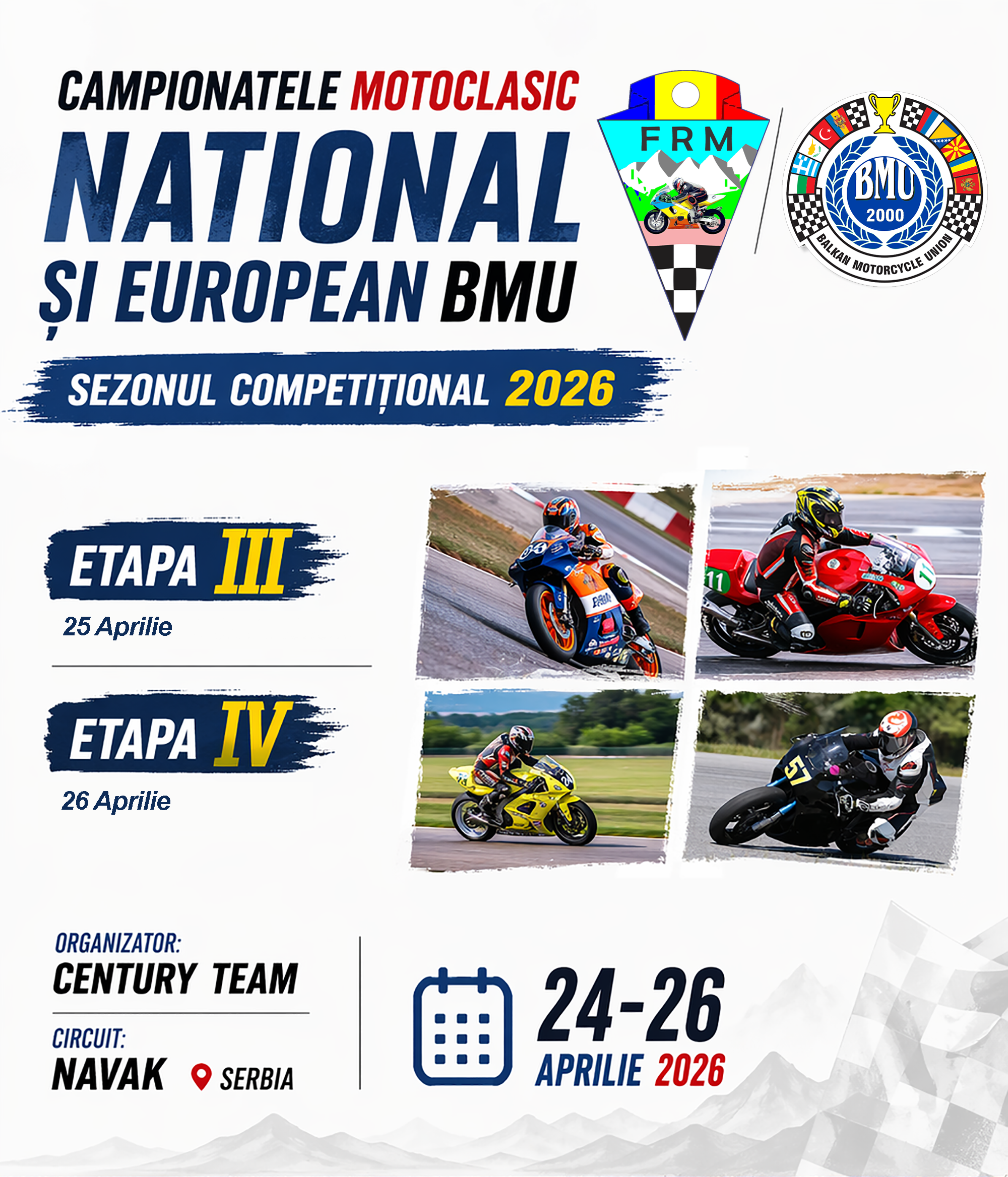 Peste doar trei zile sunt programate etapele III si IV ale campionatelor Motoclasic nationale și balcanice din sezonul competițional 2026. Etapele naționale vor fi organizate de către clubul Century Team, concursul urmând să se desfășoare pe circuitul din Navak, Serbia între 24 și 26 Aprilie 2026.